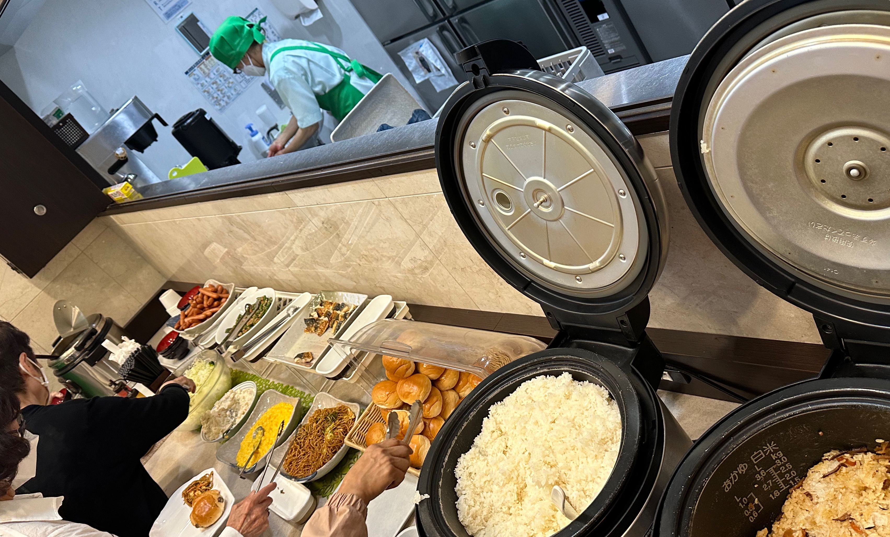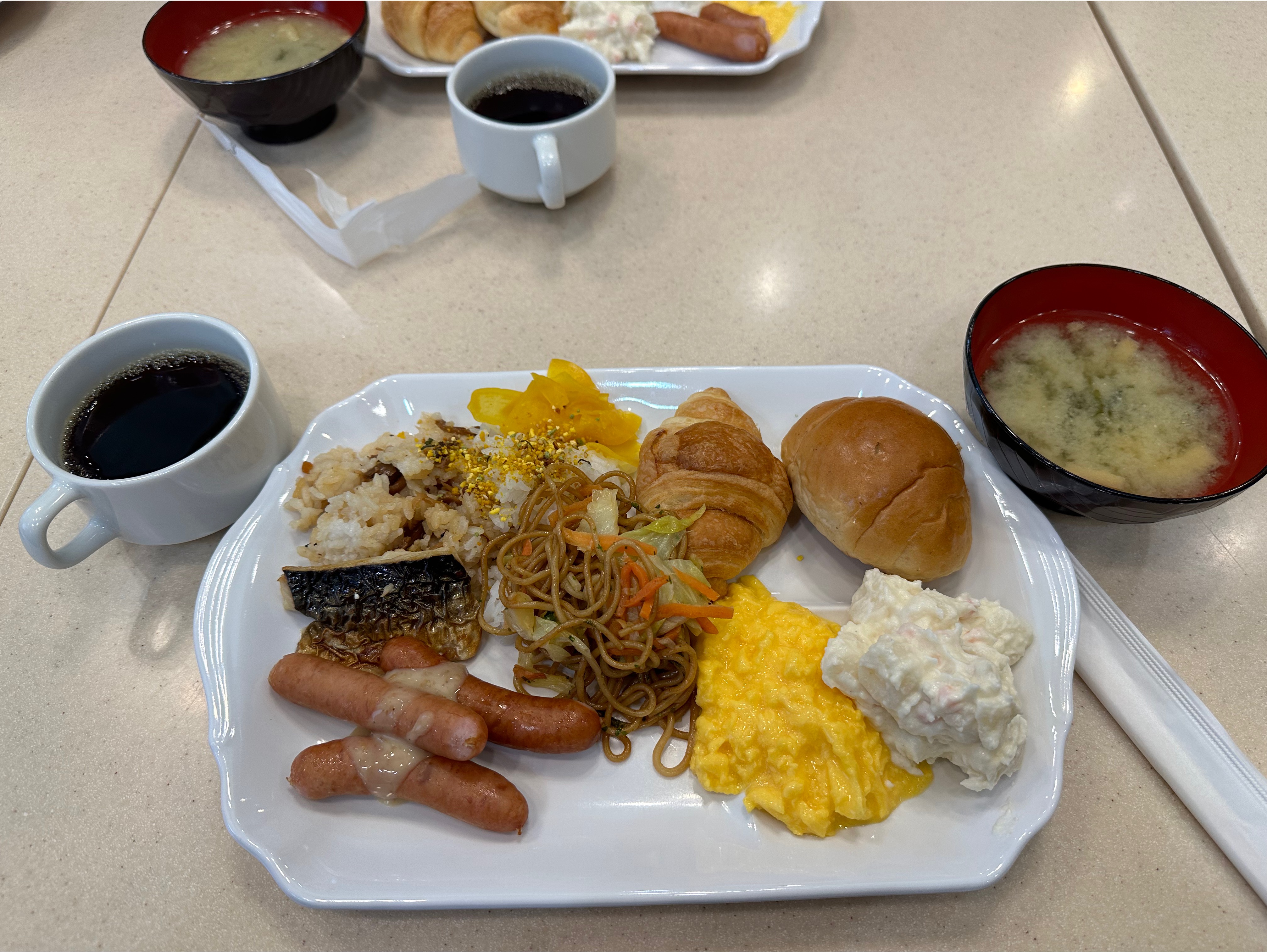 밥도 2종류나 있고 빵, 볶음면, 스크램블, 소시지, 고등어구이, 샐러드, 반찬, 된장국이 준비되어 있어요